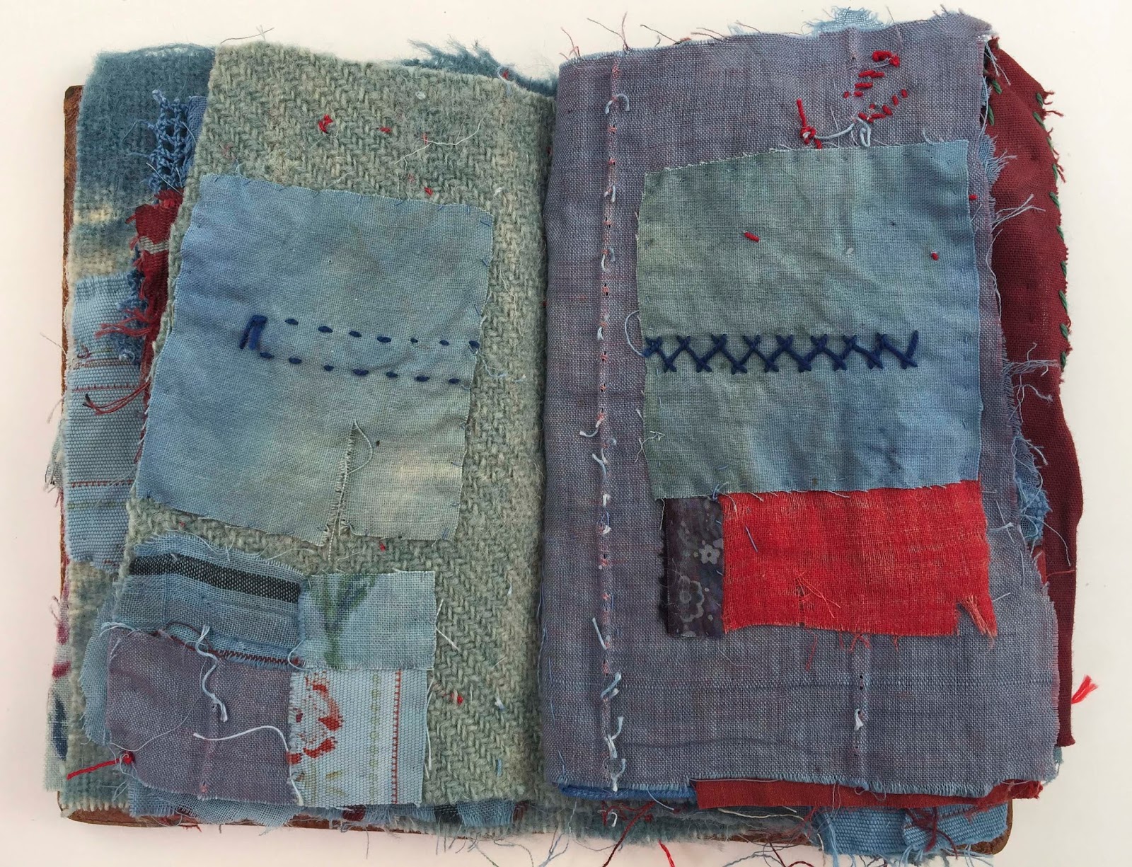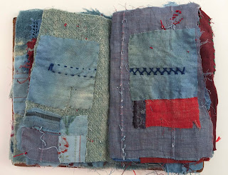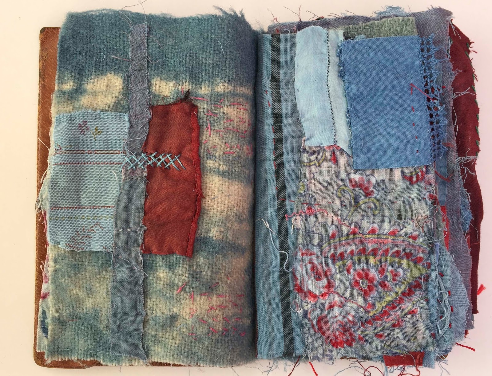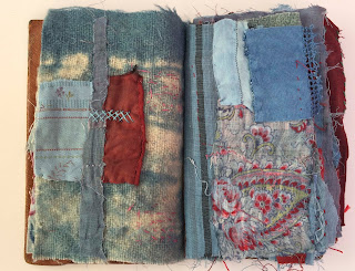 In the summer at Chateau Dumas I showed students how to make beautiful fabric diaries within old leather wallets. We had had a fun day dyeing everything in sight in the woad vats and here is the book I have eventually finished of pieces that I dyed myself and little bits from some of the students. The photographs are in the exact order of the pages ( I think!) I enjoyed using the red/ woad combination. Just love doing these……….