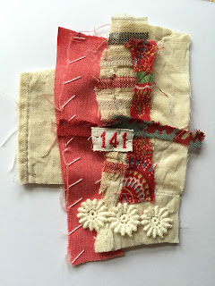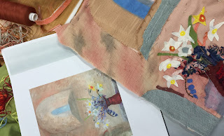 This textile collage is a bit like my allotment. Nothing much going on but getting ready - fleece over the broad beans, old bits of carpet suppressing the weedy paths and some patches dug and some with manure still sitting on the surface. I quite like it as it is but over the next week will bring it in to new life with some green shoots, which in the north of England are just starting to appear. Having a garden or allotment makes you aware of how precious our environment is and how important GREEN is every Spring. Will post next week when I have embroidered some life on to it!